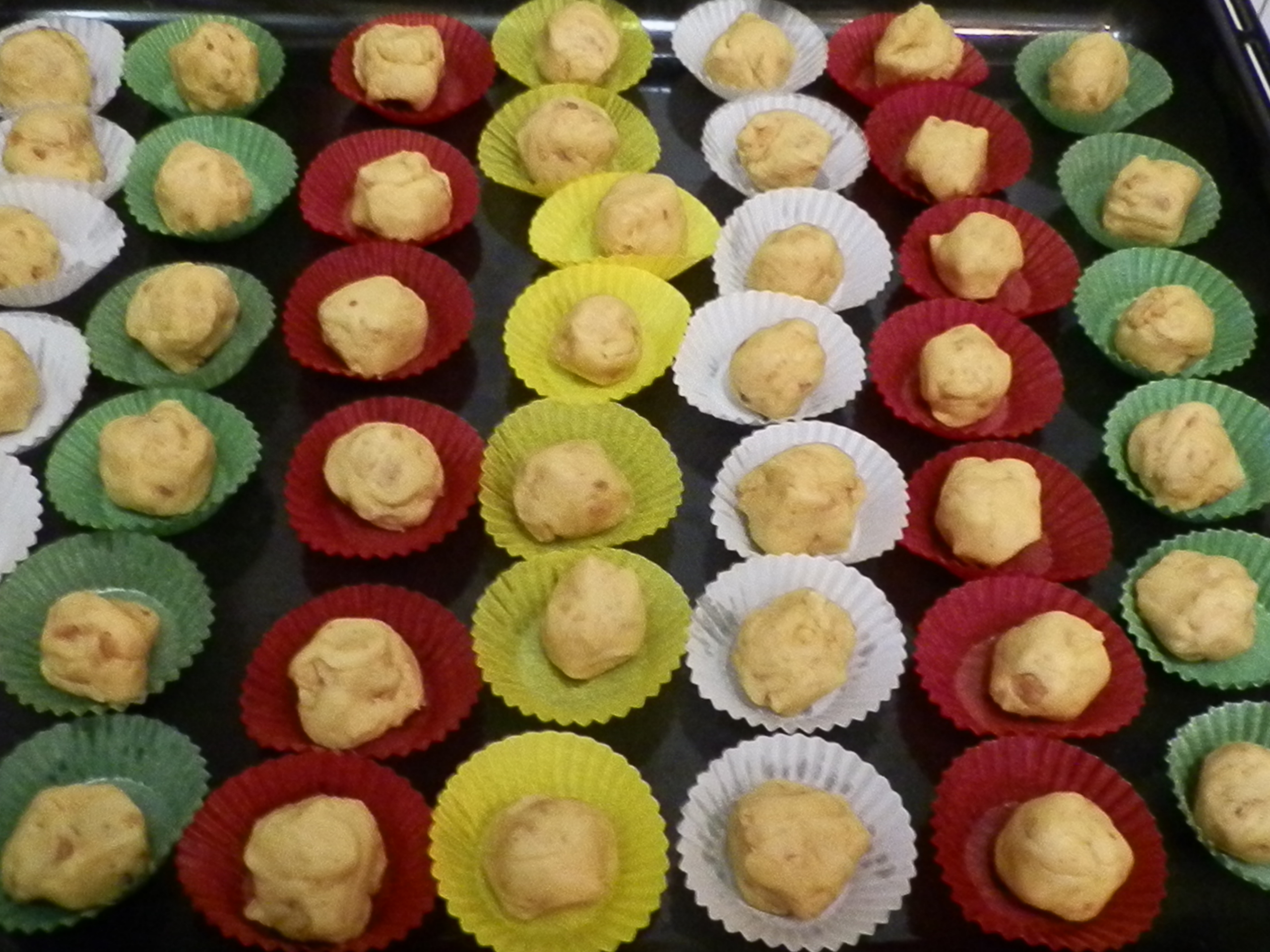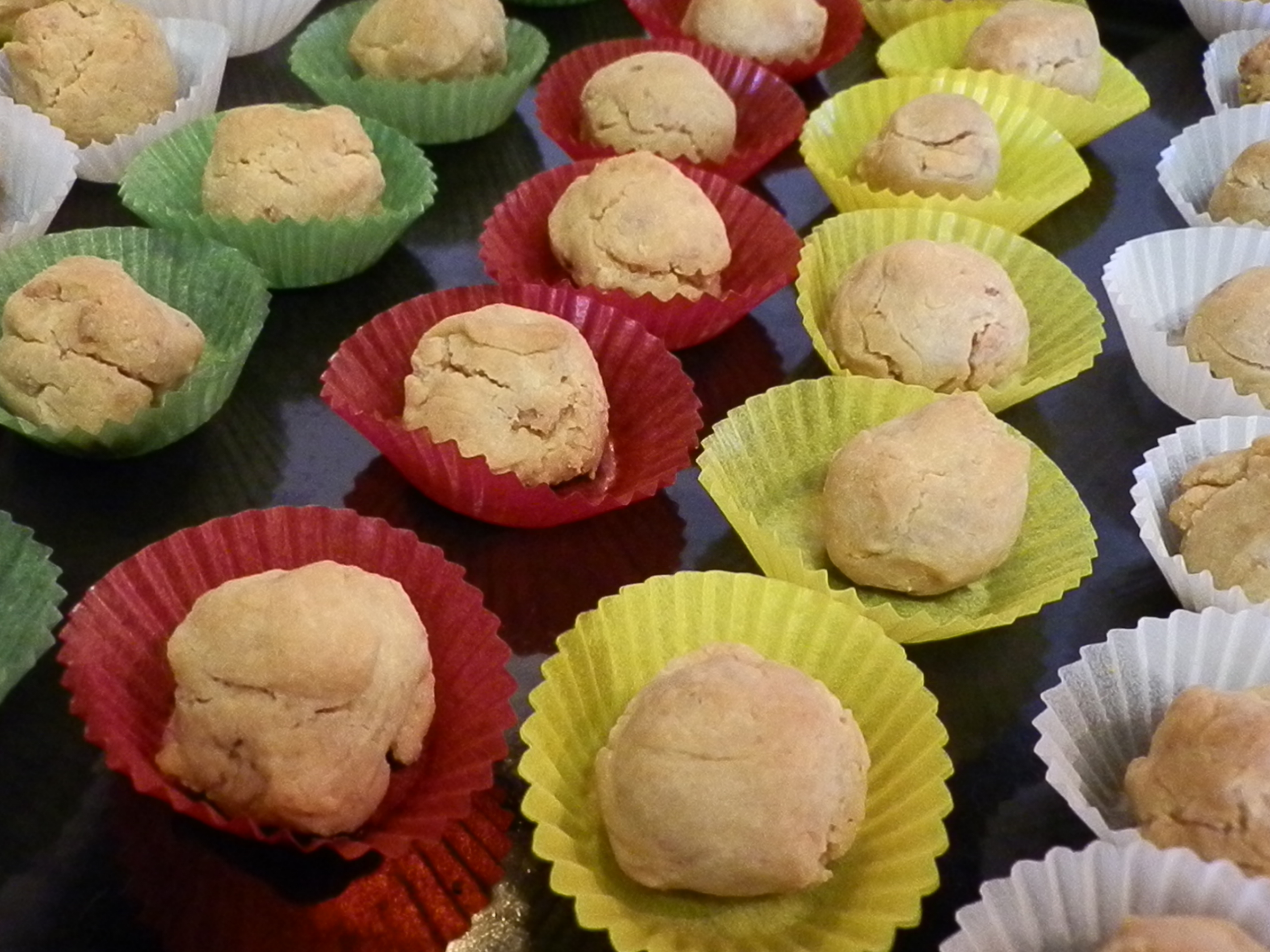 Rifaccio le palline e, stavolta, nel dubbio che non tengano, le metto su dei coloratissimi pirottini che scovo nella dispensa della pasticcera perfetta