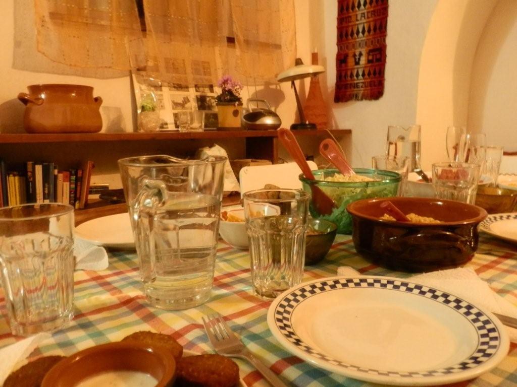 Ma la tavola e già apparecchiata per dieci, con tovaglia a quadri di tutti i colori, piatti spaiati, bicchieri spaiati, posate spaiate. Solo i tovaglioli son tutti uguali